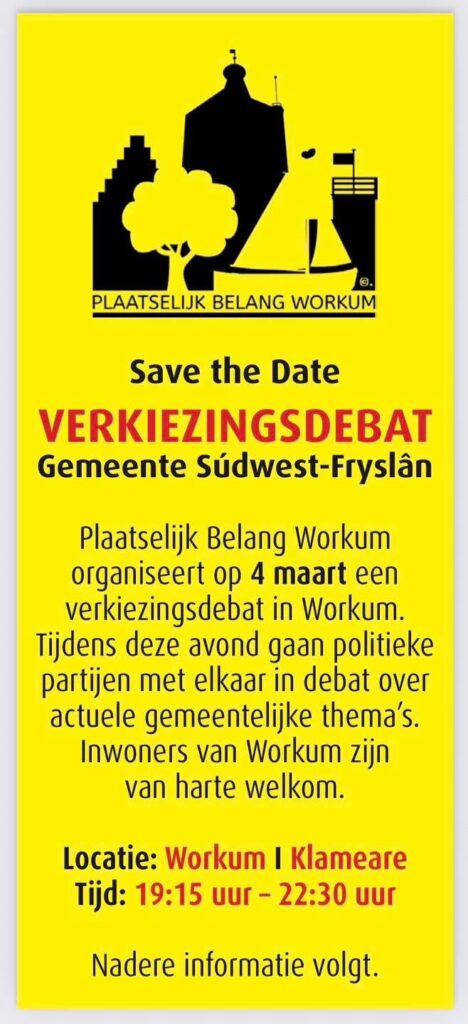Plaatselijk Belang Workum organiseert op 4 maart a.s. een verkiezingsdebat in Workum. Tijdens deze avond gaan politieke partijen met elkaar in debat over actuele gemeentelijke thema’s.