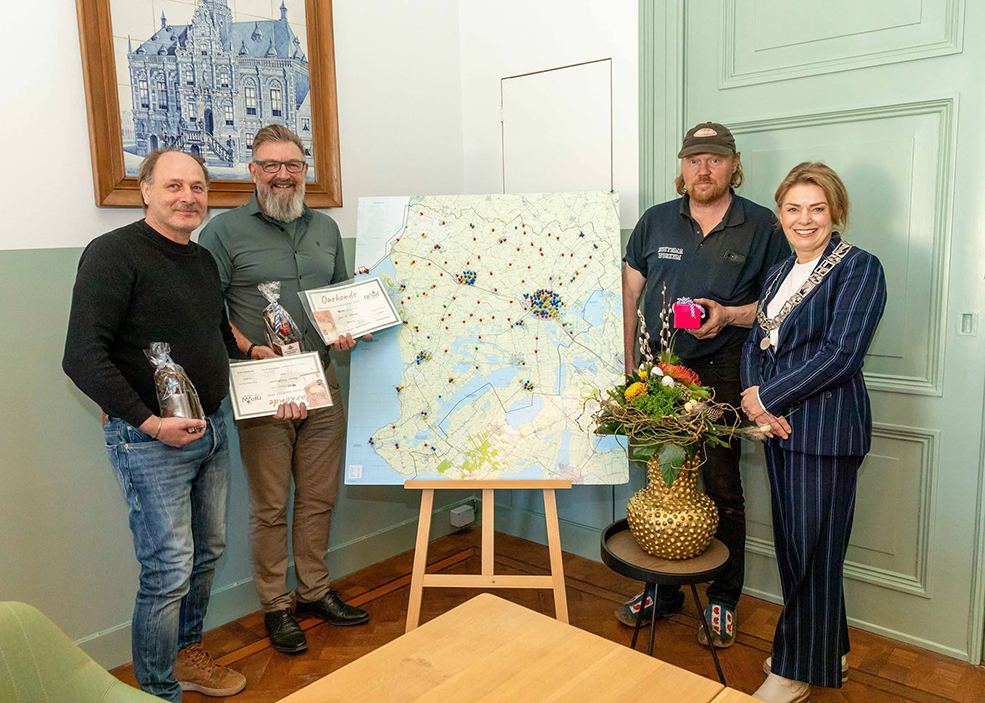 Dinsdag 11 maart vonden Jan Kroese en Marco Veldhuizen het eerste kievitsei van Súdwest-Fryslân. Ze vonden het op de Workumerwaard. Boer Pee Huitema had het land mooi op tijd klaargemaakt en hier kon deze kievit van profiteren. Jan en Marco kregen een oorkonde van burgemeester Jannewietske de Vries. Daarnaast staat er een houten ei met hun namen erop in het kievitseikastje in het gemeentehuis. (Bron Friso. Foto: Petra Kroon)