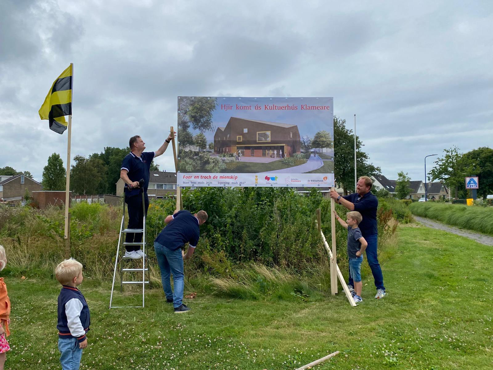 Afgelopen donderdag hebben wethouder Bauke Dam, Roelof Fopma (voorzitter van het bestuur van de Klameare) en Sijmon Bruinsma (de beheerder van de Klameare) het bouwbord op het terrein geplaatst in bijzijn van gebruikers, genodigden, betrokkenen en belangstellenden. Het was een enthousiast en feestelijk moment waarbij gezamenlijk geproost werd op een voorspoedige bouw.