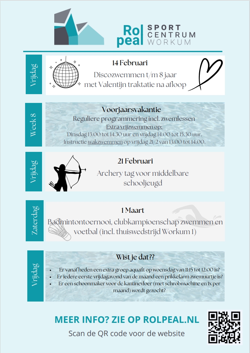 Voor de jongere jeugd of oudere belangstellenden is er op vrijdagmiddag 21 februari een instructie wak-zwemmen. Hoewel er voorlopig nog niet op natuurijs geschaatst kan worden, is deze oefening natuurlijk zeer leerzaam. Aansluitend is er net als op dinsdagmiddag extra vrijzwemmen in de voorjaarsvakantie. Verder is het de reguliere programmering inclusief zwemlessen. De voorjaarsvakantie begint komende vrijdagavond met discozwemmen voor jeugd t/m 8 jaar met een leuke Valentijn traktatie na afloop.