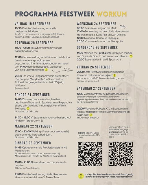 Workum is een van de laatste plaatsen waar nog een veekeuring plaats vindt. Met keuring Fries Stamboekvee, concours hippique en ‘s avonds vuurwerk. Rond de Veekeuring is een zeer complete feestweek georganiseerd met diverse activiteiten voor jong en oud. Voor een donatie kunt u de QR code scannen