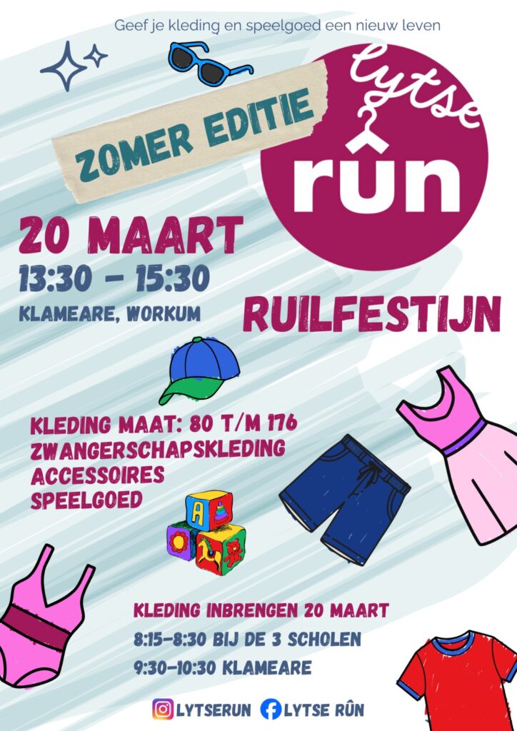 Er staat in de vroege ochtend vanaf 8.00 uur tot 8.30 uur een rode bus van Lytse Rûn bij de drie scholen in Workum waar ouders ( als ze de kinderen naar school en/of opvang brengen) kinderkleding kunnen inbrengen vanaf maat 80 t/m 176. Ook hier is de inbrengnorm 5 stuks per kind van het gezin.
